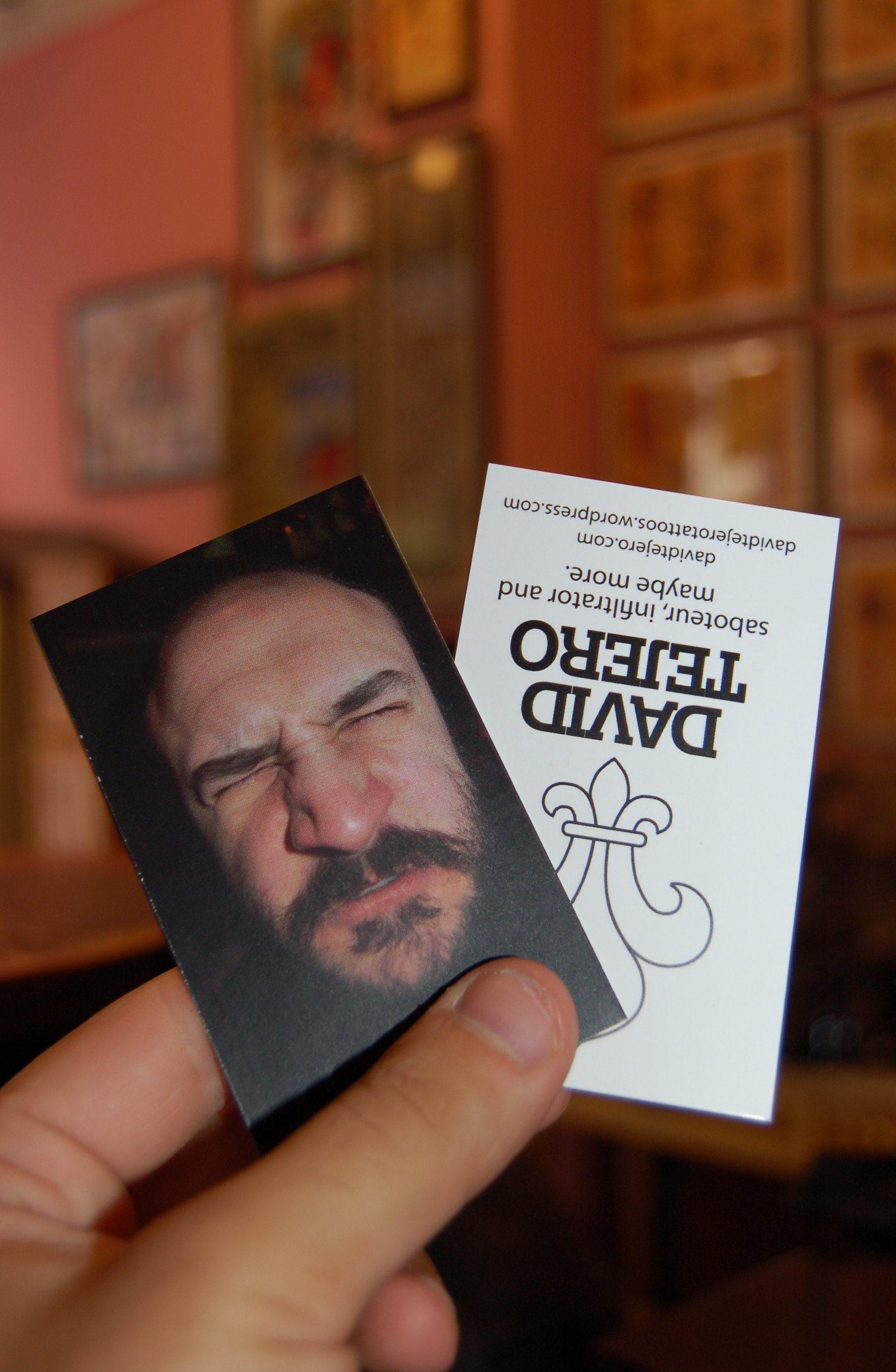Y no os perdáis la crema de la mierda en lo que a tarjetas se refiere!! Aconsejado por el Carlo y el Rotor, me pasé por fotoprix para hacerme unas tarjetas bien baratas y cutres para dar en la Convención. El objetivo era pagar lo mínimo por 100 tarjetas para salir del paso. Lo que no me esperaba era tamaño despropósito en una puta y simple impresión digital!!! Descentrada, con la información en la cara posterior del revés, mal cortadas…. todo un lujo para los amantes del feísmo. Realmente estoy contento con el resultado. El dependiente de fotoprix se ha sentido un tanto humillado cuando le he dicho textualmente que me gustaban mucho porque eran una basura!
