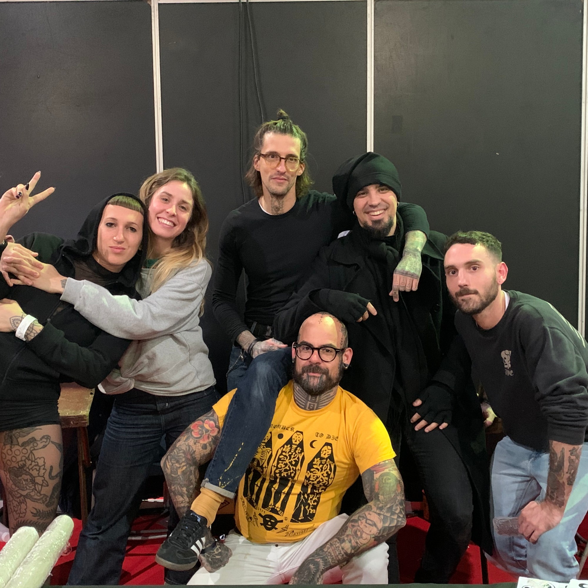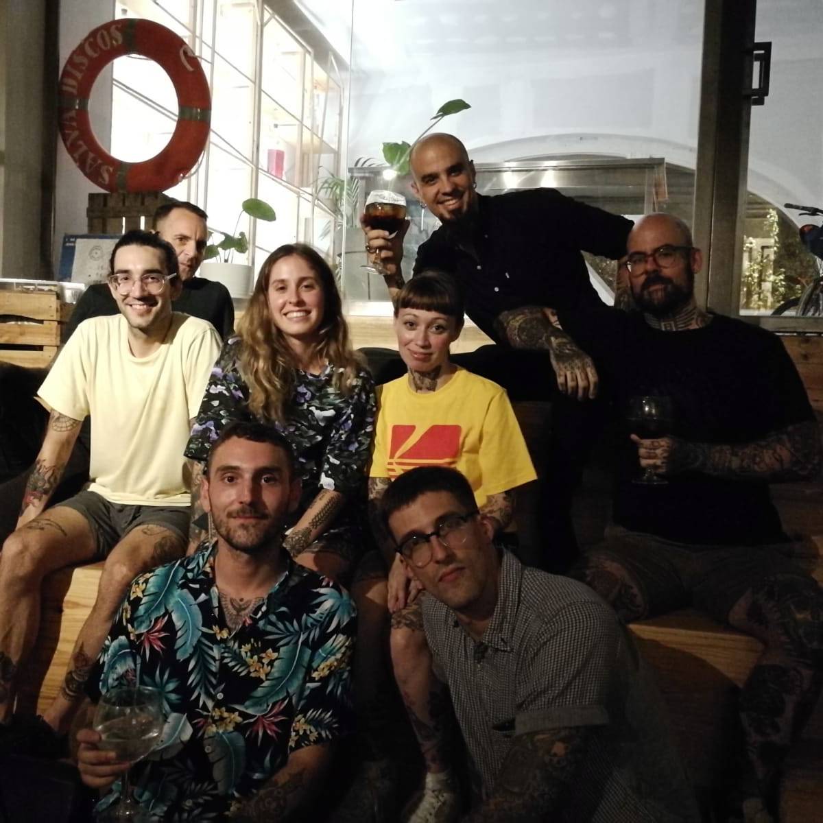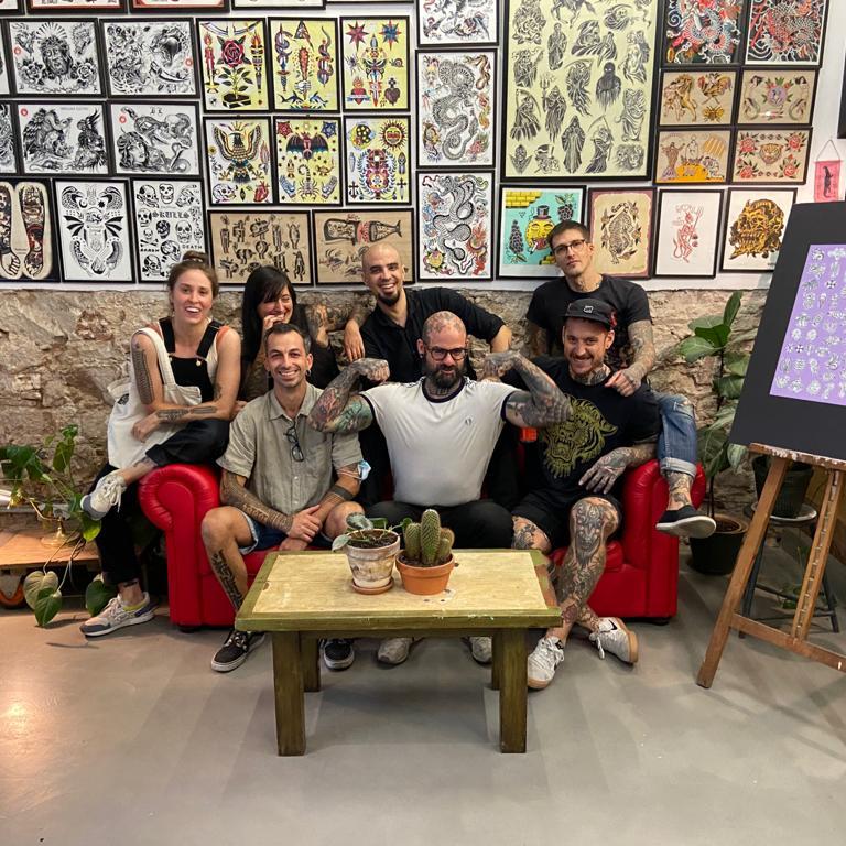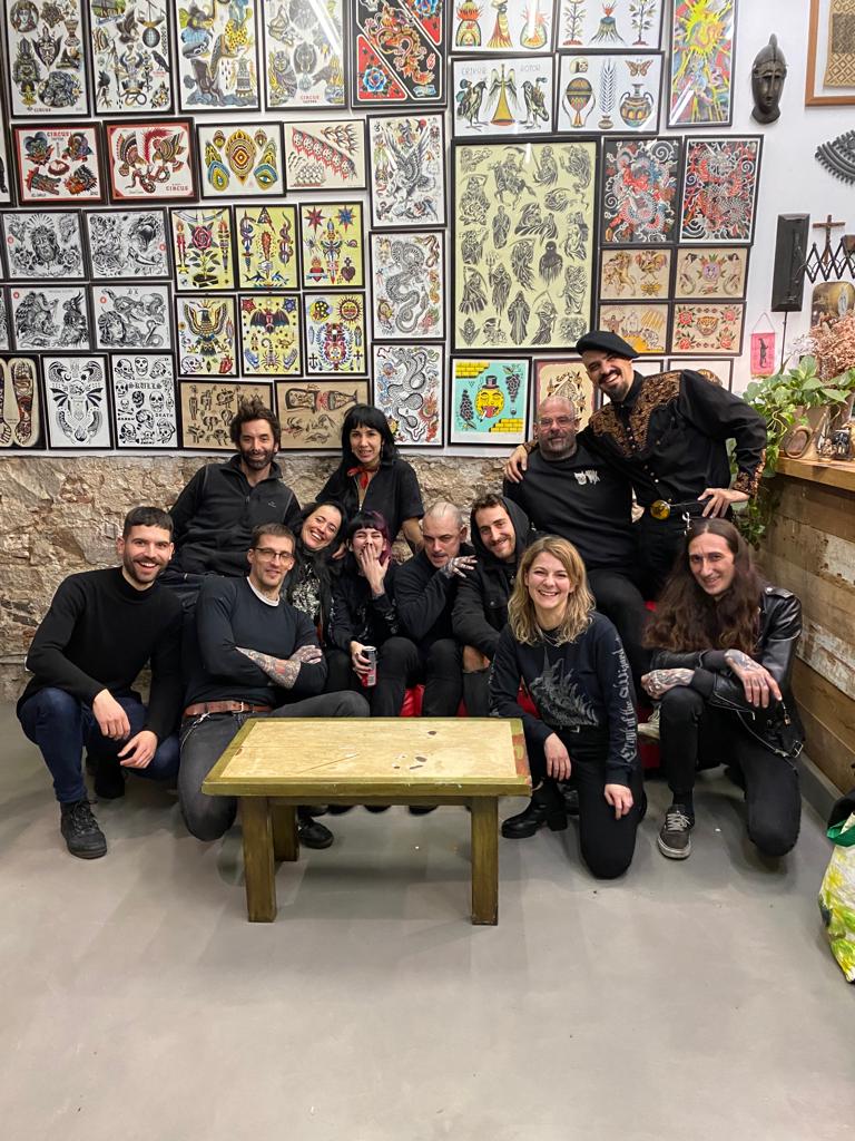 En la apertura y previamente a ella también, nos acompañaron Anana y Nacho Eterno. Además, pudimos contar con la compañía de nuestro amigo Mark Mason durante los veranos. Desde entonces, el grupo ha crecido muchísimo y pasado por varios e inevitables cambios. A día de hoy somos Carlo, Rotor, Anana, Iñaki, Tayri, Pablo Sinalma, Lean, Misharuka, Olracle III, Miriam, Vitorio y yo mismo. También en una corta etapa nos acompañaron Jorge Teran y Numi. Además, encabezando la lista de sospechosos habituales, hemos tenido con nosotros a Rafa de Blas en diversas ocasiones. Y sin tatuar pero sabiendo mucho de tattoo, agendas, y redes sociales, nuestro amigo y manager precovidiano Oriol. Cerrando el bloque nuclear, no nos olvidamos de Oliver que nos ha echado una mano en eventos y viajes siempre que se lo hemos pedido.