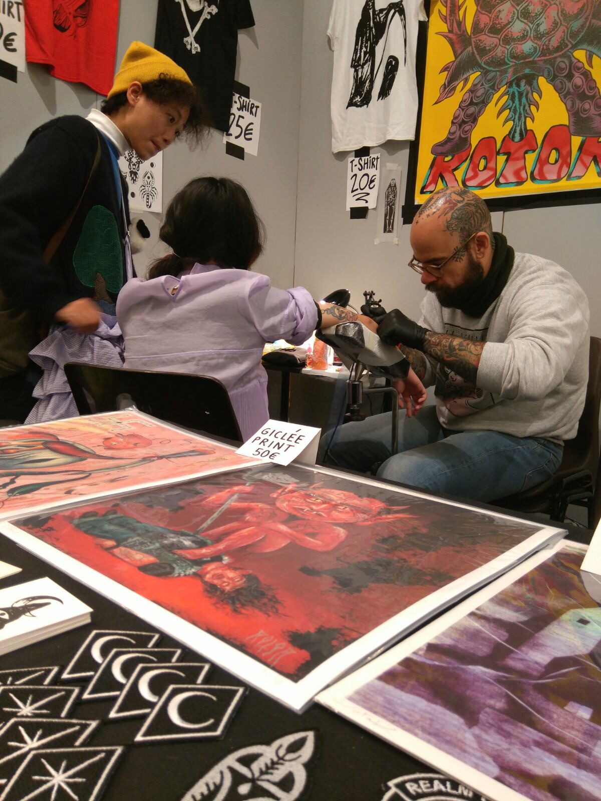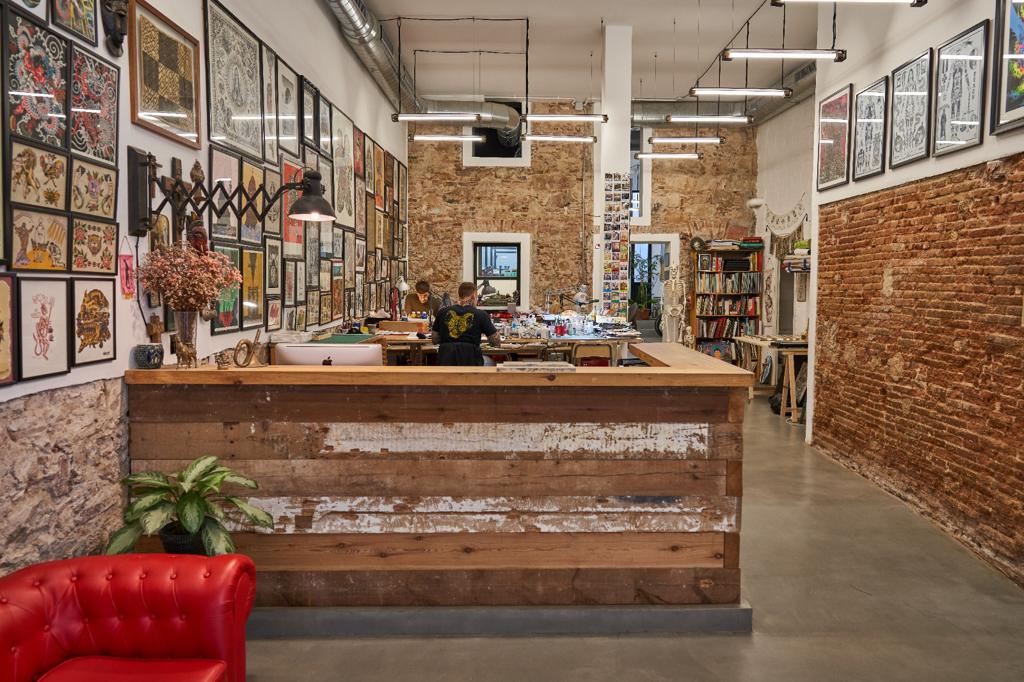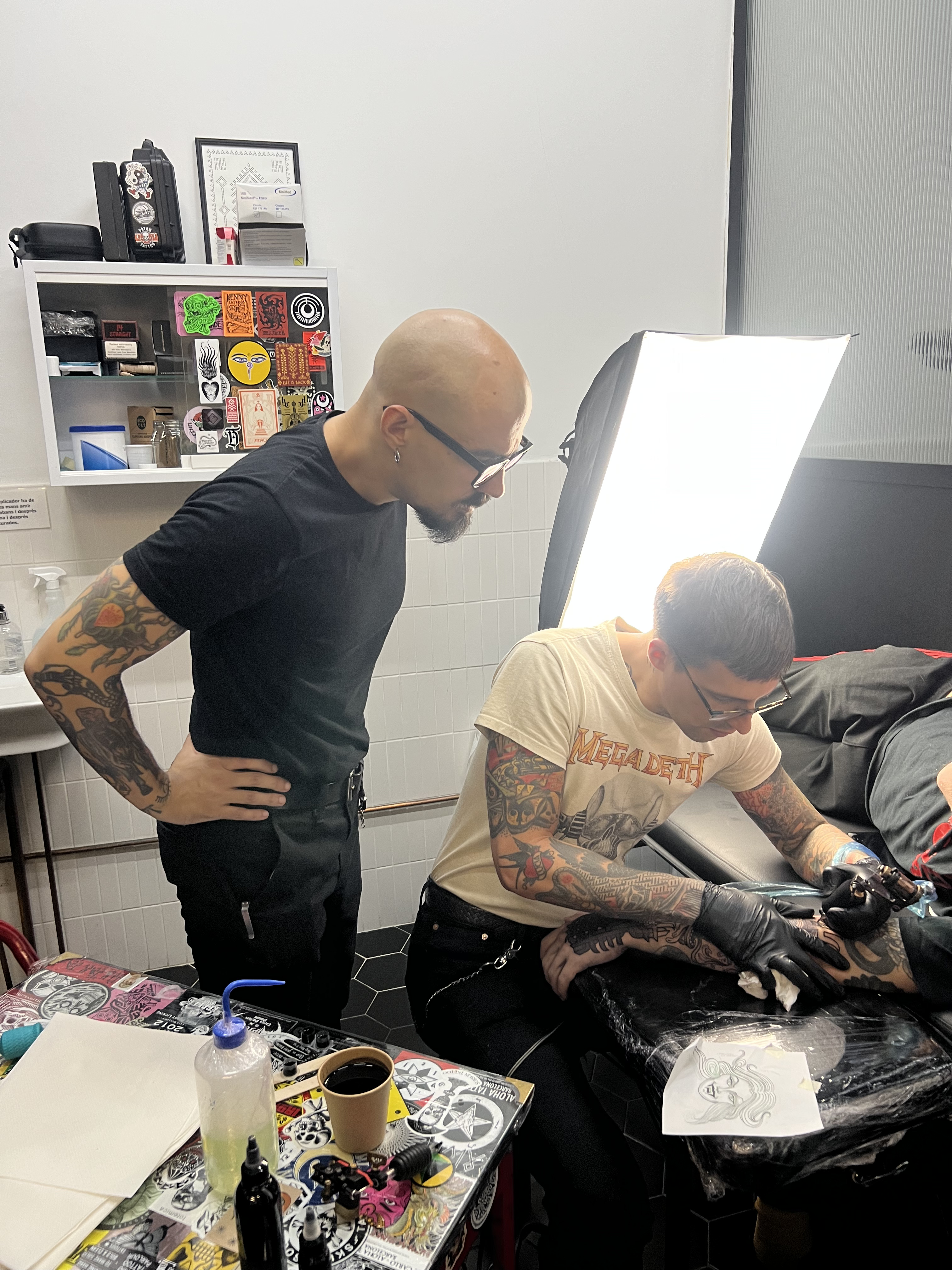 ¡Pero…! No solo de tatuadores vive el homínido. Recordemos a nuestros colaboradores, que nos han ayudado en muchos proyectos de distinta naturaleza, pero principalmente en lo que a merch se refiere: Miki y Albert de Newtownlab, Xavi y Paco de Impressionart, Pere y Agustin de Flaix Offset, Terry de Black Bible Books, Jose María del ya desaparecido ArtPlus, Gemma de Serigrafía Monostereo y el dealer favorito de todos: Lorenzo de Okulus bookshop. Para las materias primas de lujo, Max de Og Tattoo Supply. Para el hardware y el taller, nadie mejor que Eugeni y Tomás de Hardcraft Company.