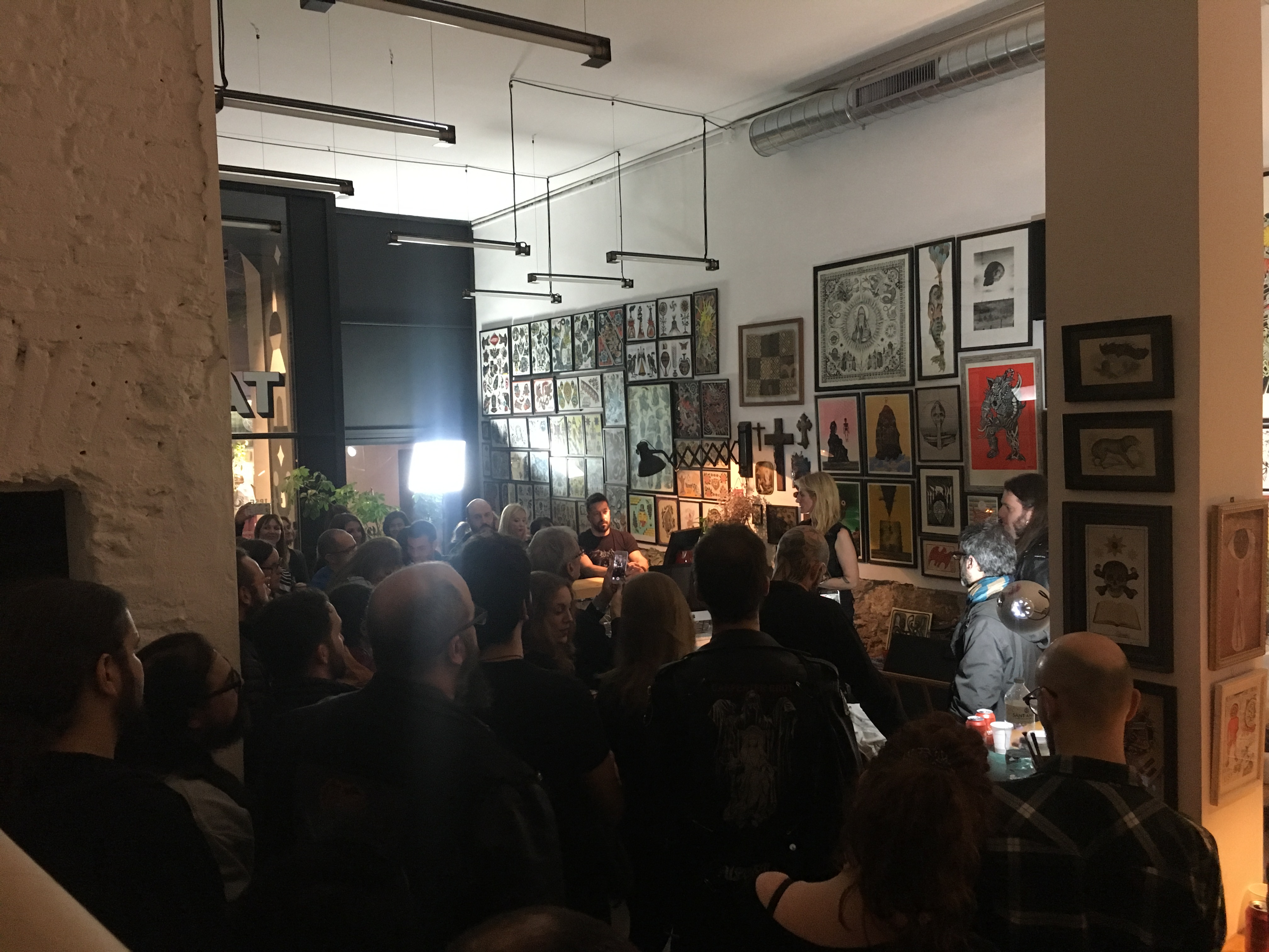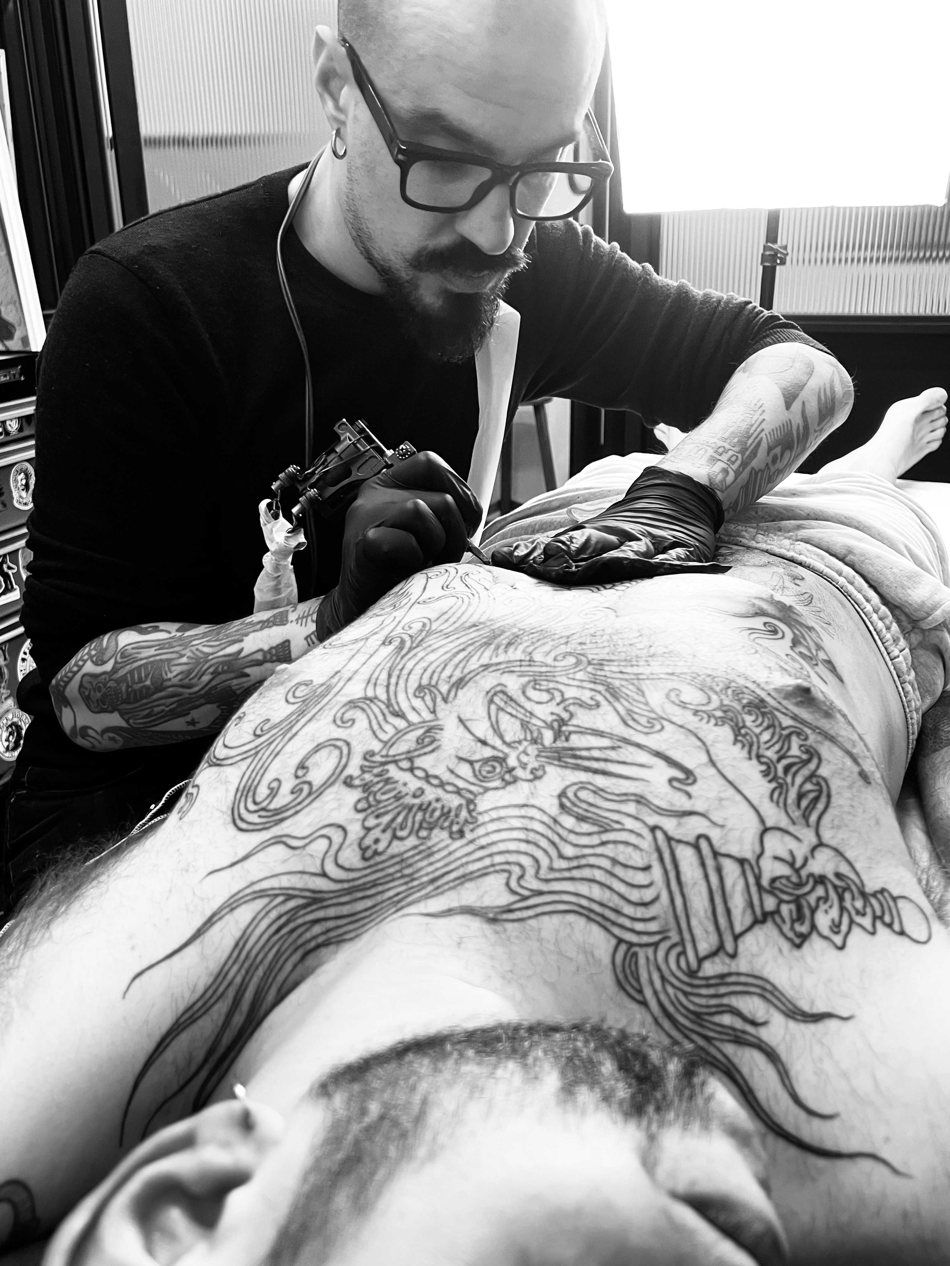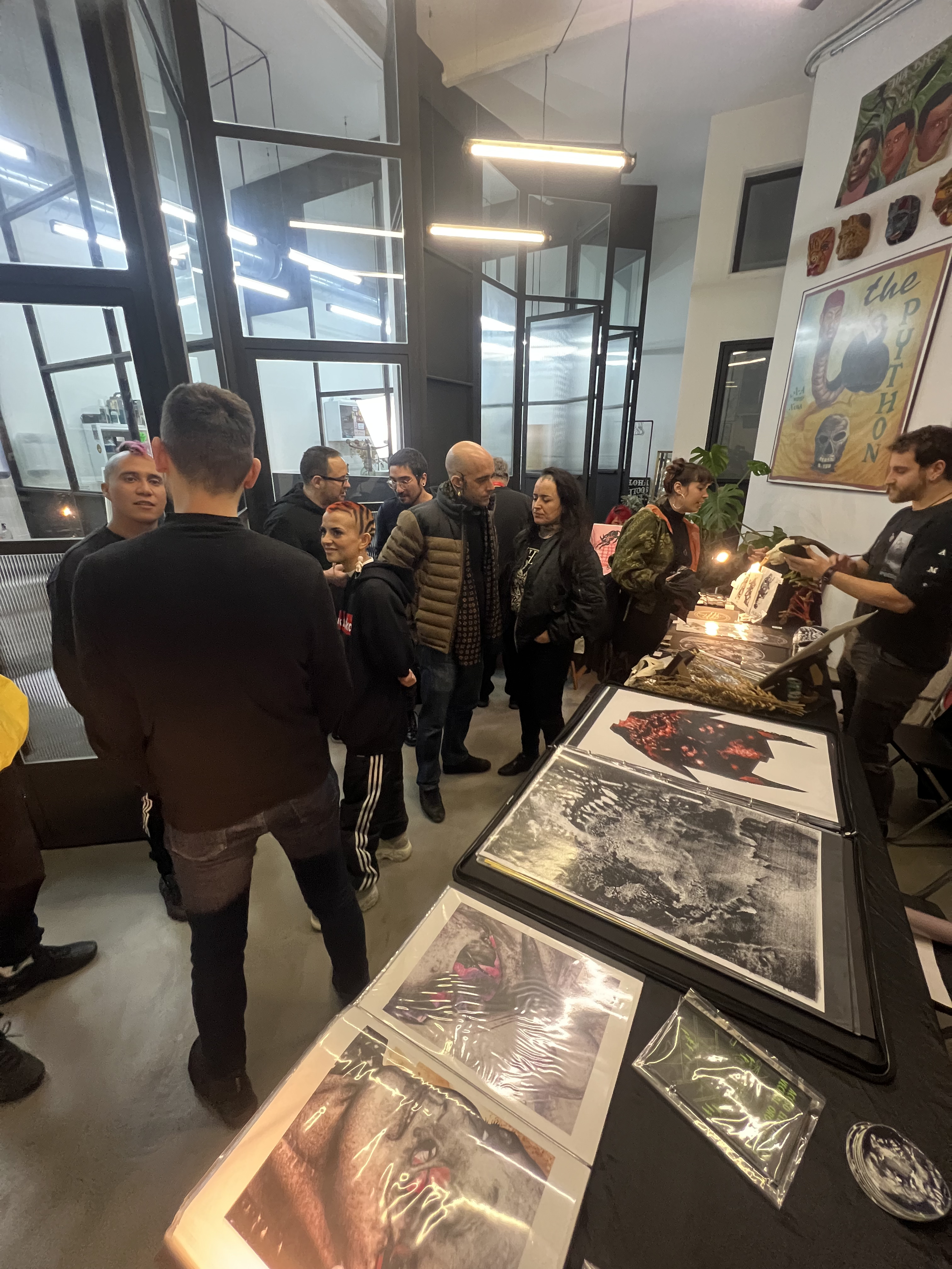 ¡Pero…! No solo de tatuadores vive el homínido. Recordemos a nuestros colaboradores, que nos han ayudado en muchos proyectos de distinta naturaleza, pero principalmente en lo que a merch se refiere: Miki y Albert de Newtownlab, Xavi y Paco de Impressionart, Pere y Agustin de Flaix Offset, Terry de Black Bible Books, Jose María del ya desaparecido ArtPlus, Gemma de Serigrafía Monostereo y el dealer favorito de todos: Lorenzo de Okulus bookshop. Para las materias primas de lujo, Max de Og Tattoo Supply. Para el hardware y el taller, nadie mejor que Eugeni y Tomás de Hardcraft Company.