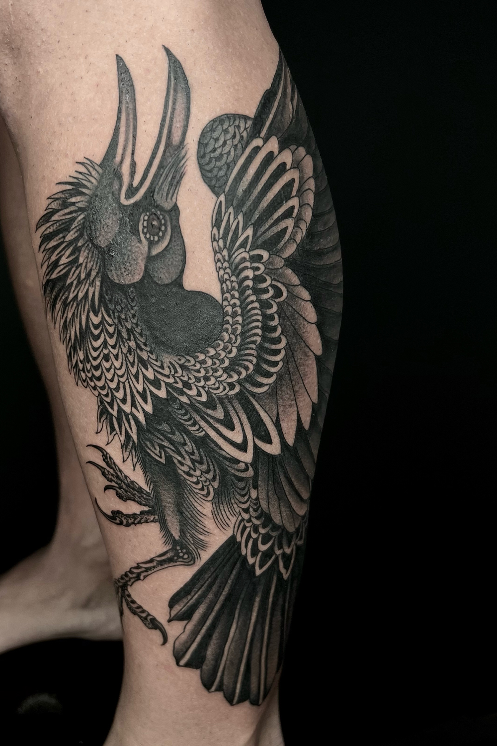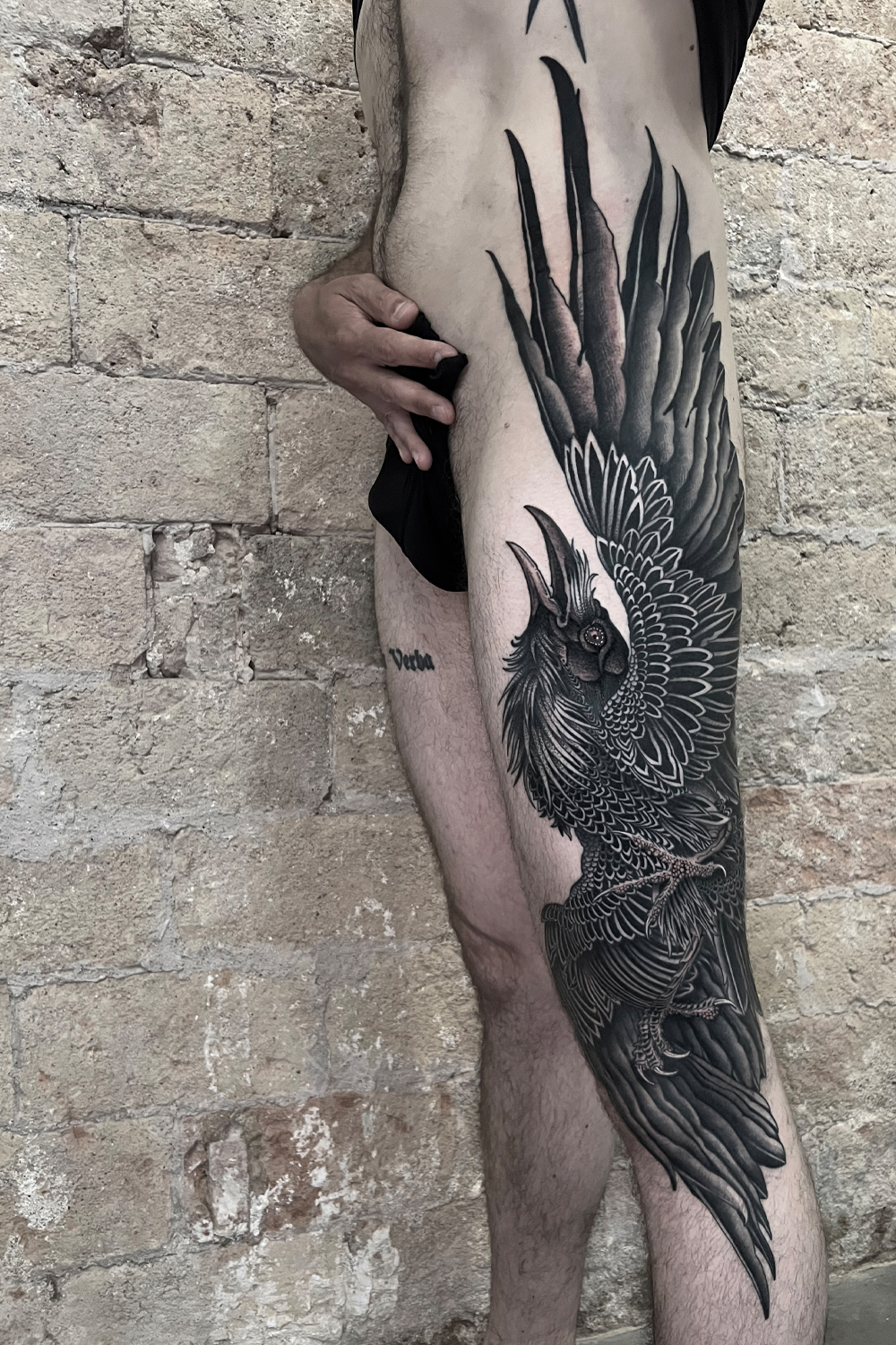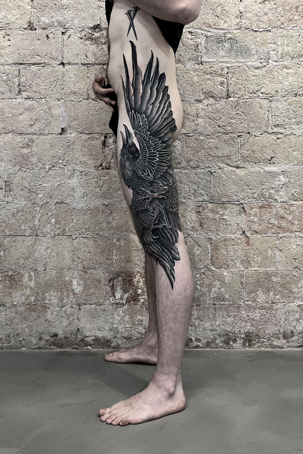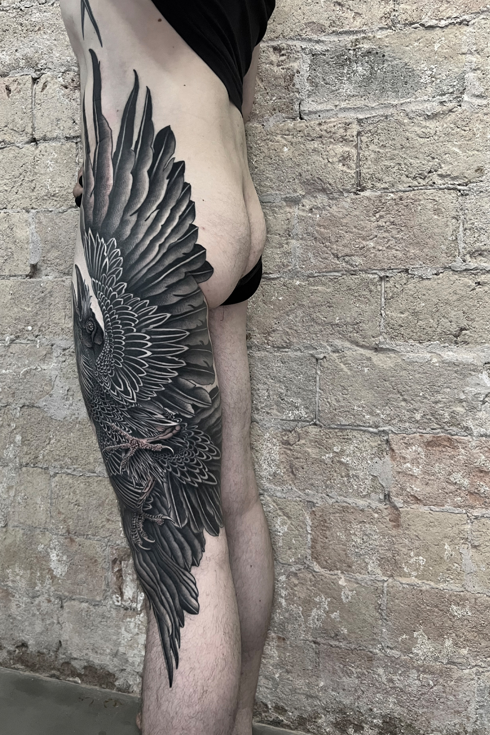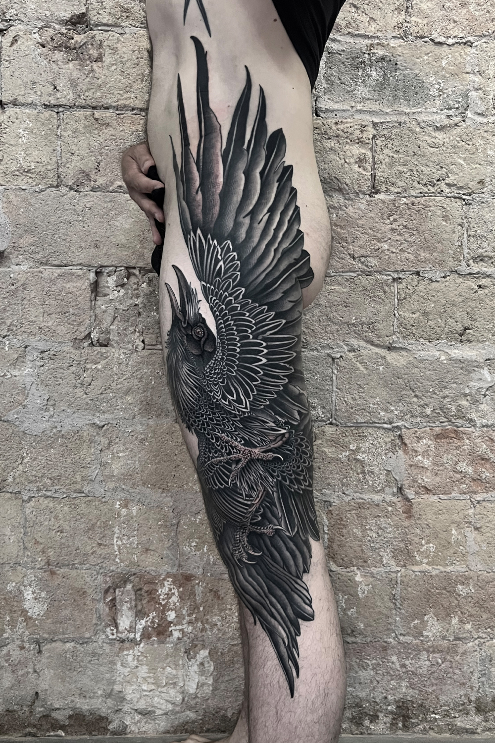 Antes de empezar el verano toca hacer repaso de los tattoos hechos en estos últimos meses. Por tamaño y esfuerzo, el primero es este gran cuervo para Marcos, que ha estado viniendo desde Madrid directamente para hacerse una sesión tras otra en un tiempo record. Estoy muy contento con el resultado con el que es hasta la fecha el cuervo más elaborado y grande que he tenido la oportunidad de realizar. Ha sido un reto eso sí, entender el mejor encaje posible cuando tienes a la vez tanto espacio para trabajar pero has de colocar lo mejor posible todos esos grupos de plumas.