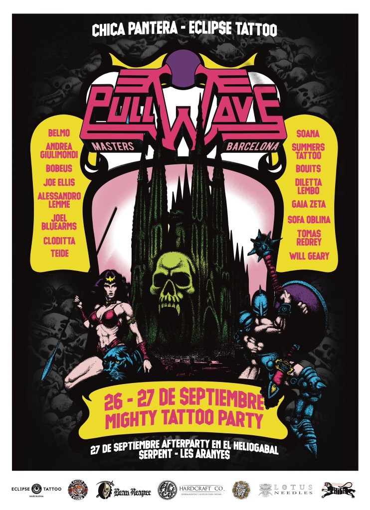 Pullwave Masters es una iniciativa conjunta de Eclipse Tattoo Barcelona, Chica Pantera y Rodrigo D.C con su marca RUIN para organizar en Barcelona un evento de tattoo diferente y valioso. Esta pequeña lista de sospechosos habituales no es más que una pequeña muestra de un amplio colectivo de tatuadores y estudios, tanto locales como nacionales, que no se sienten representados por la mayoría de convenciones o shows de tattoo que se organizan de forma habitual en nuestras ciudades. Después de un tiempo de hartazgo, poca reflexión, algo de astucia napoleónica y sobre todo, habiéndonos sacado de encima el polvo post pandemia pandemonium, hemos decidido pasar a la acción. Por primera vez, vamos a reunir en un evento con dos sedes, a una buena lista de tatuadores y tatuadoras internacionales que además son colegas nuestros y tienen un nivel altísimo.