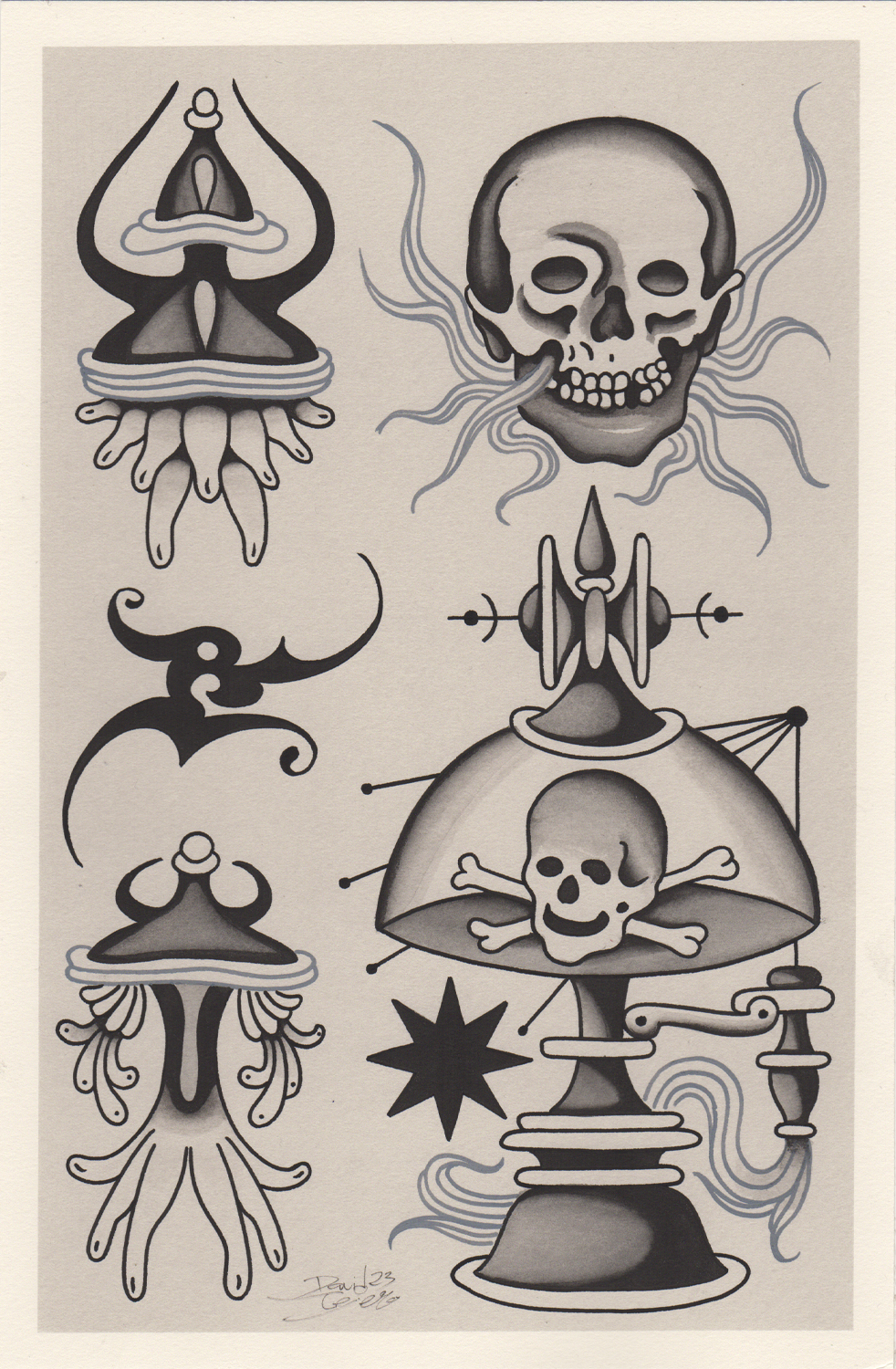 Finally! The Eclipse book is online and available through the studio’s online store. A compilation of original artwork, flash and tattoo pictures from El Carlo, Rotor, Anana, Pablo Sinalma, Lean Skvll, Kohlver, Verónica, Juanito Maldito, Anuk, Pilof, Marta, Patt and myself. 117 black and grey pages printed in risography by Jumbo printers in Barcelona. This is a limited edition of only 100 copies, and we are running low! If you want to discover the rest of my contribution and the work of my friends, there’s only one way…buy it!