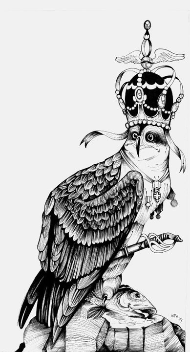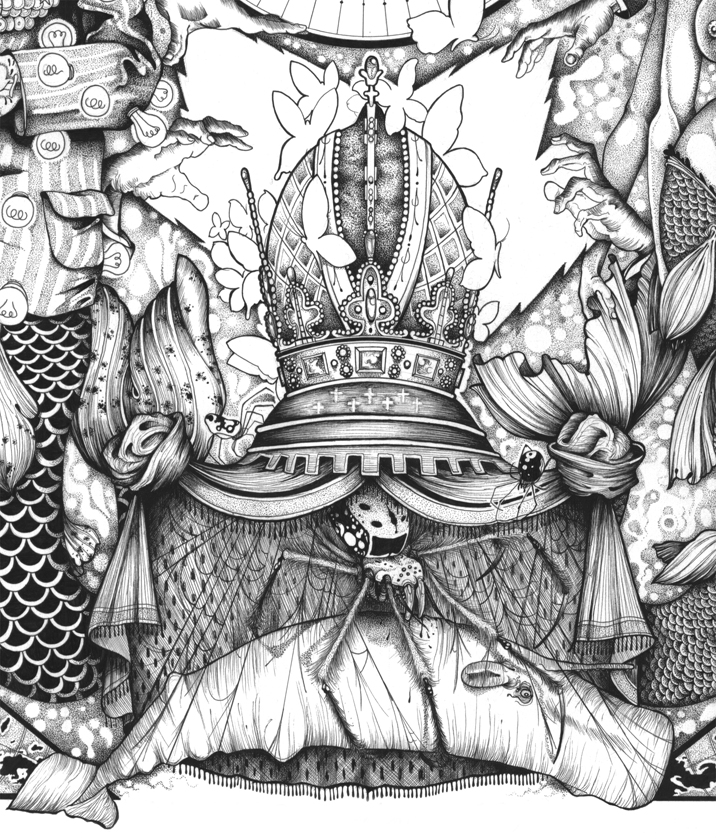 En el centro, el manto heráldico con la corona imperial albergan los conceptos de la ambición y el trabajo. El primero está representado por la gran ballena blanca. Todos deberíamos tener una y para mí, sin duda alguna, este animal representa el sueño a perseguir. ¿Cómo alcanzamos esa ambición que da forma a una biografía? Pues trabajando. La arañas tejedoras son animales trabajadores que con paciéncia, consiguen cazar a sus presas. En este caso, con el trabajo se alcanza ese sueño. Las manos que otorgan energía a esta concepción fluyen del interior de los dos demiurgos, fijaos bien.