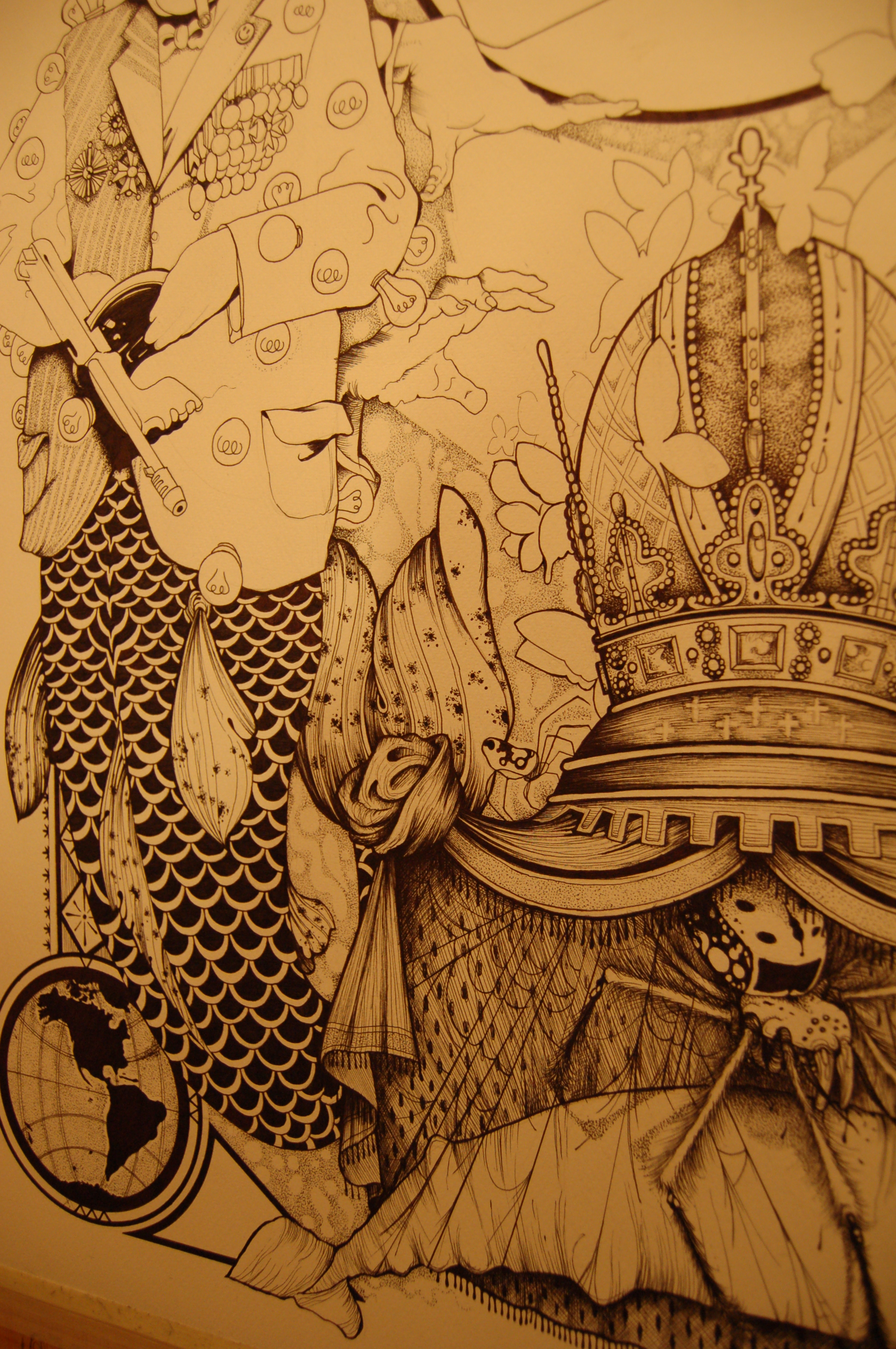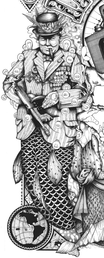 ¡El Demiurgo Churchill! A ambos lados de la corona con el manto heráldico estan situados dos demiurgos creadores, simbolizando precisamente eso, la creatividad. ¡Permitiéndome una idea estúpida, les puse sexo! A la izquierda lo masculino, representado por Winston Churchill empuñando una ametralladora y colmado de medallas. Para la creación es necesario un componente de violencia, de ruptura. Las bombillas en el traje son un detalle que saqué del videoclip de la canción Space Lord, de los Monstermagnet. Si tienes bombillas en el traje seguro tienes buenas ideas.
