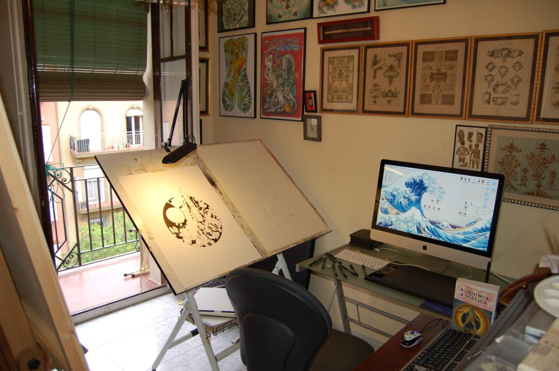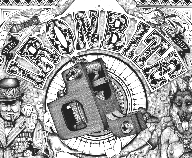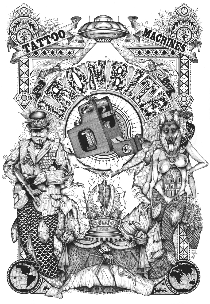 Después de unos cuantos meses de trabajo por fin he acabado esta ilustración para Ironbite. El original mide 100×70 cm y está realizado con pilot negro V5 y V7 sobre papel Fabriano de 350gr/m2 50% algodón. Ha sido un placer regalárselo a Miguel y poder contribuir, esperemos, a la buena marcha de la marca. Si eres tatuador profesional y necesitas máquinas de calidad, Ironbite tiene algo que decir al respecto. Venden a nivel nacional e internacional y mi experiencia ( me consta también la de muchos otros ) es muy satisfactoria.