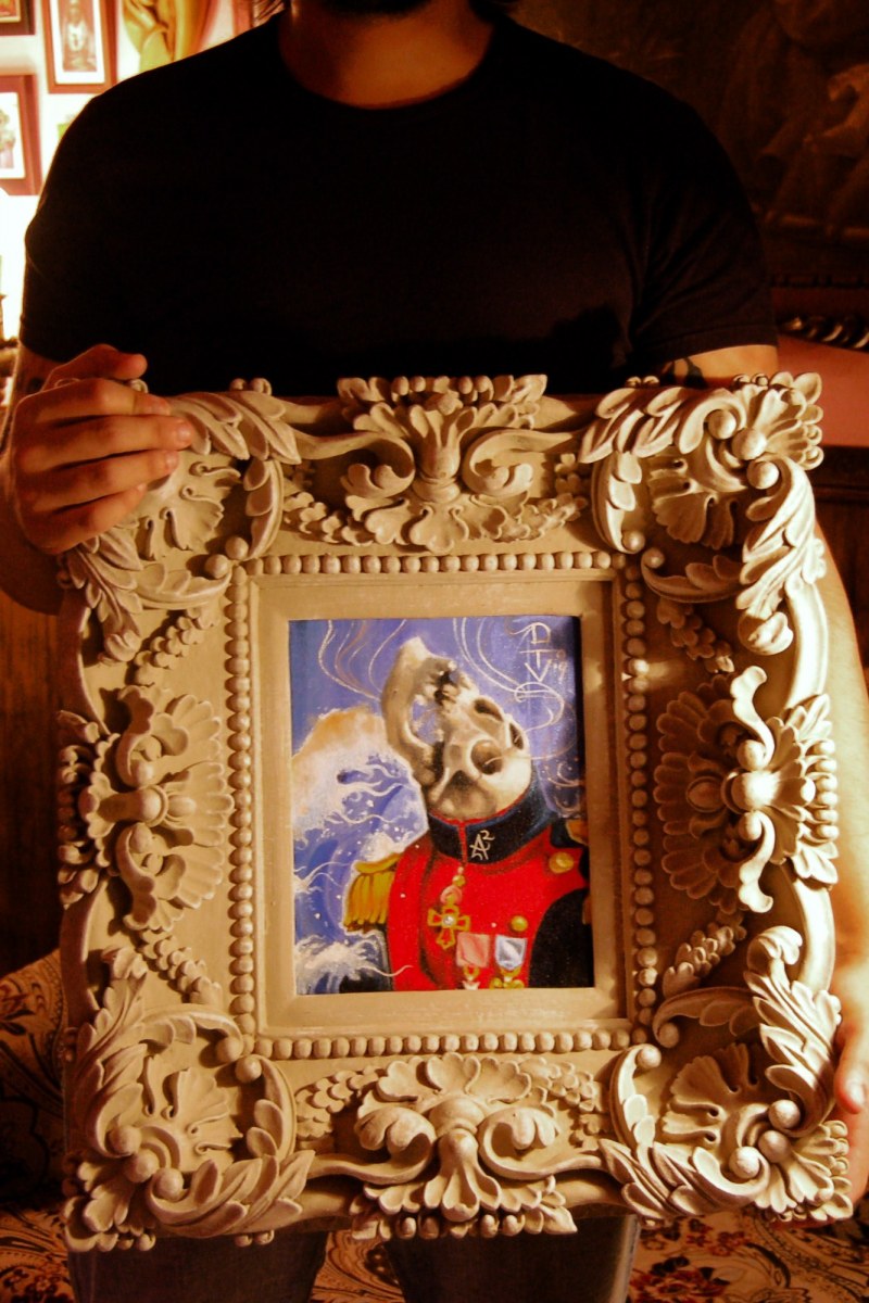 Un regalo para el Monga y todos los depravados que trabajan en el Aloha Tattoos de Barcelona. Este cuadro al óleo es una colaboración con Cristina Rofes, el proceso duró casi 8 meses! Se combina el óleo con collage, un passpartout hecho a medida para la ocasión y la enmarcación con una pieza espectacular! Este marco lo compré en un anticuario de Barcelona, originalmente contenía un espejo grabado al ácido…pura artesania!