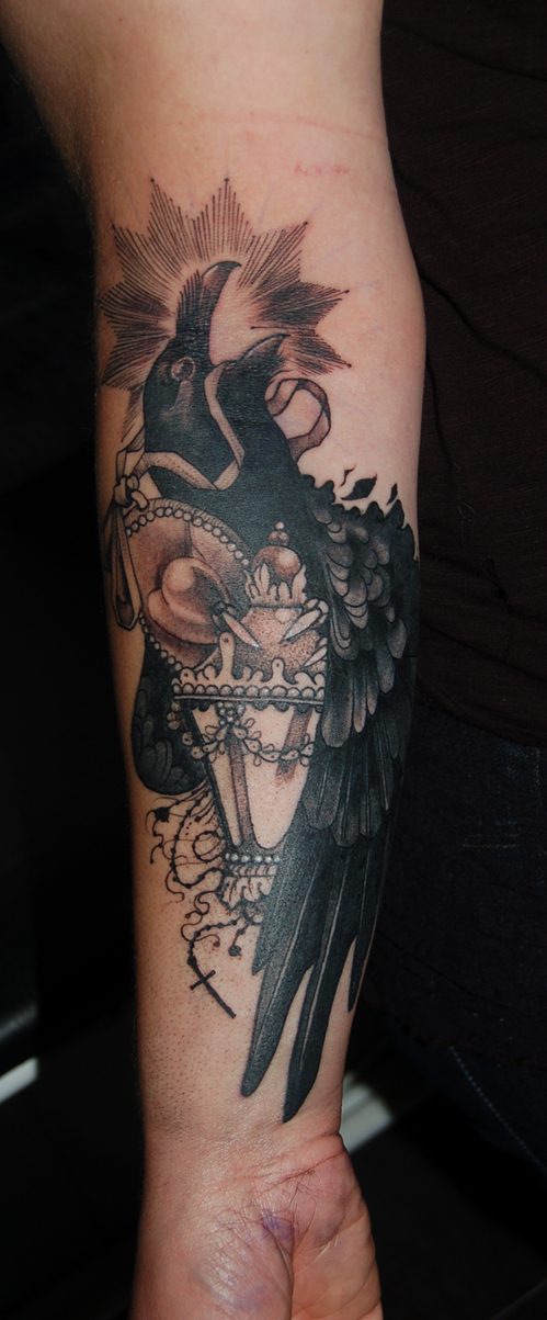 Antes de empezar el verano toca hacer repaso de los tattoos hechos en estos últimos meses. Por tamaño y esfuerzo, el primero es este gran cuervo para Marcos, que ha estado viniendo desde Madrid directamente para hacerse una sesión tras otra en un tiempo record. Estoy muy contento con el resultado con el que es hasta la fecha el cuervo más elaborado y grande que he tenido la oportunidad de realizar. Ha sido un reto eso sí, entender el mejor encaje posible cuando tienes a la vez tanto espacio para trabajar pero has de colocar lo mejor posible todos esos grupos de plumas.