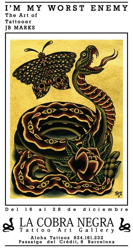 El próximo viernes 30 de marzo, a partir de las 20:30 h, La Cobra Negra estrena nueva exposición. La idea, iniciativa y sufrimiento personal corren por cuenta de Rotor, quien ha decidido reunir la obra ilustrativa de ocho tatuadores.  El origen o concepto que da forma a esta propuesta es la conexión estética entre los participantes, que pese a usar cada uno técnicas que desembocan en resultados gráficos totalmente diferentes, comparten una visión y sujetos similares a representar. Una visión accesible de lo oscuro, producida por tatuadores pero sin recurrir a los motivos tradicionales del tatuaje occidental o las extensas producciones de tattoo flash.