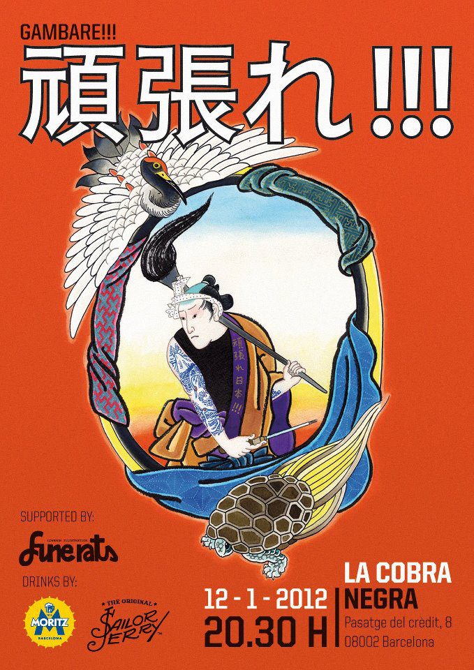 A partir del próximo dia 12 de enero, el proyecto solidario Gambare da un paso más.  Se expondrán obras originales de tatuadores japoneses y lo recaudado con su venta se seguirá destinando a las víctimas y supervivientes del tsunami. Además, habrá expuestas también herramientas de tatuaje tradicional japonés y prints en venta. Si el arte te da igual y a ti lo que te mola es salir en las fotos del facebook, ¡pásate igualmente y diviértete bebiendo cerveza moritz y ron saaailor jerry!