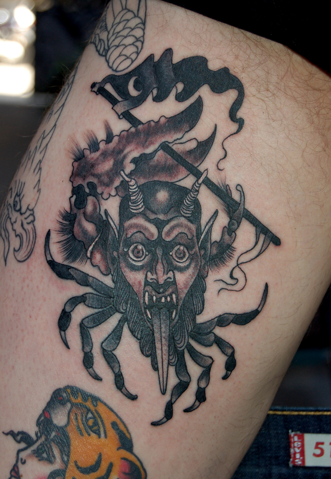 ¡Hace unos días me lo pasé tremendo haciendo este tattoo! La idea incial de un cangrejo del infierno me llevó un poco de cabeza, pero al final creo que logré dar con un diseño conciso y efectivo. Le doy las gracias a Carlo por el intercambio de tattoos, los buenos ratos y los consejos. Nunca olvidaré haber estado tan cerca de su hinchado paquete en Aloha Tattoos Barcelona.