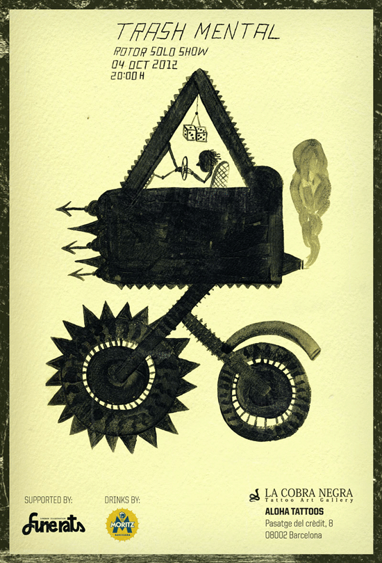 Este próximo jueves La Cobra Negra Tattoo Art Gallery estrena nueva exposición. Rotor ha organizado un monográfico sobre su producción artística más reciente. Como descripción para animaros a venir, os cito las palabras del autor directamente: