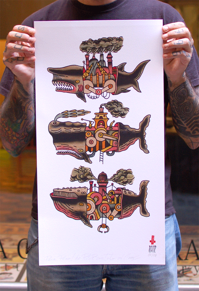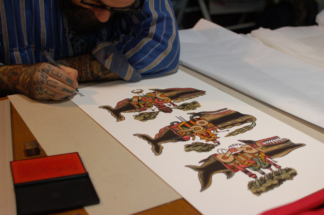 Esta sesión de firma de los giclée se produjo horas antes de la expo «Trash Mental» del propio Rotor. Teníamos a unos cuantos invitados en la tienda y se formó una micro convención del tattoo un día antes del evento en la Farga de l’Hospitalet.